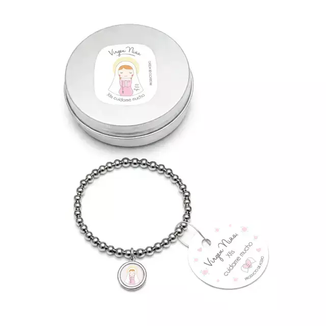 Pulsera elastizada con cuentas de acero quirúrgico y medallas de la Virgen Niña, Medalla Milagrosa o Virgen de la Sonrisa con diseño Xfis✨. Una forma tierna y original de sentirse protegido y acompañado. Viene en lata reutilizable con sticker especialmente diseñado para cada modelo.